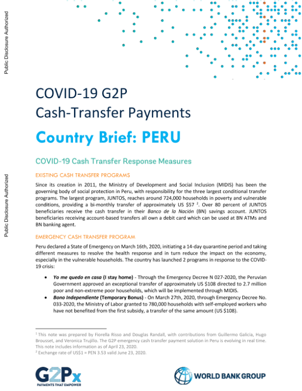 【World Bank】【2020】COVID-19 G2P Cash-Transfer Payments Country Brief PERU-3页 政策文件