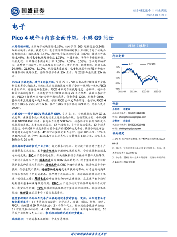 【国盛证券】【20220925】20220925-国盛证券-电子行业周报:Pico 4硬件+内容全面升级,小鹏G9问世-14页 行业研究