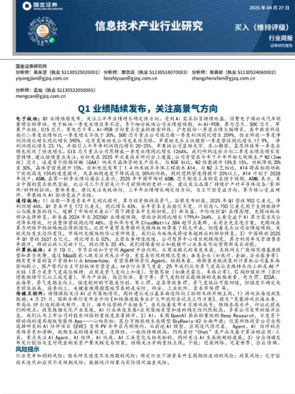 【国金证券】【20250427】信息技术产业行业研究:Q1业绩陆续发布,关注高景气方向-18页 行业研究