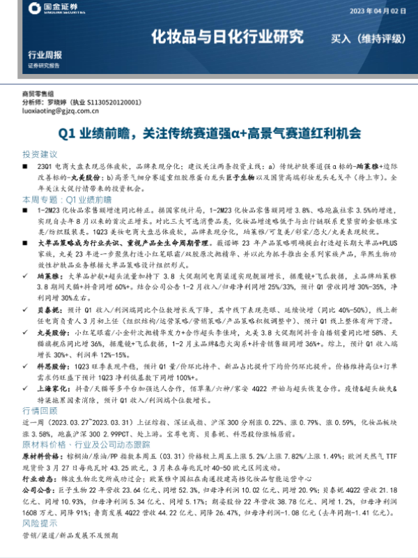 【国金证券】【20230402】20230402-国金证券-化妆品与日化行业研究:Q1业绩前瞻,关注传统赛道强+高景气赛道红利机会-13页 行业研究