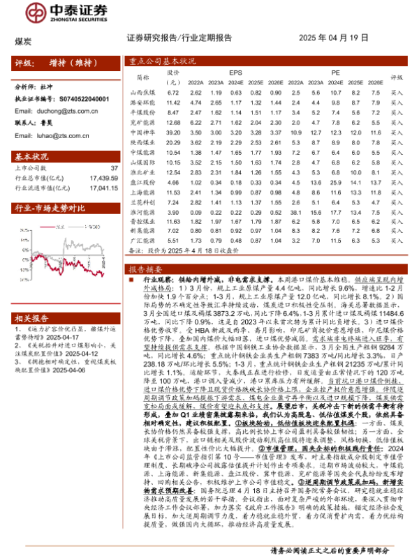 【中泰证券】【20250419】煤炭行业:Q1业绩密集披露期来临,关注相对确定性机会-23页 证券期货研究报告