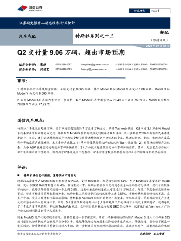 【国信证券】【20200708】特斯拉系列之十三:Q2交付量9.06万辆,超出市场预期-6页 行业研究