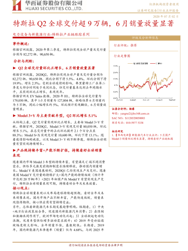 【华西证券】【20200702】电力设备与新能源行业-特斯拉产业链跟踪系列:特斯拉Q2全球交付超9万辆,6月销量放量显著-4页 行业研究