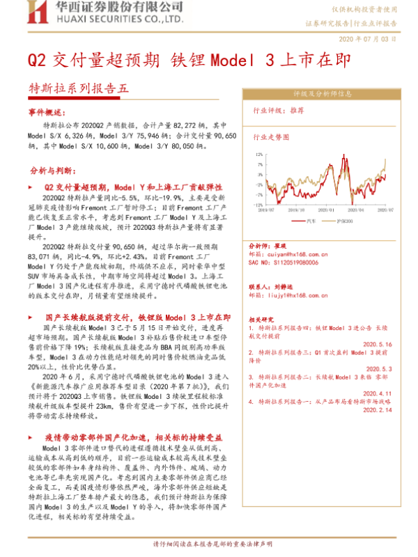【华西证券】【20200703】20200703-华西证券-特斯拉系列报告五:Q2交付量超预期 铁锂Model3上市在即-6页 行业研究