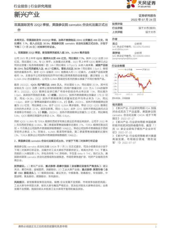 【天风证券】【20220724】新兴产业:菲莫国际发布22Q2季报,美国参议院cannabis合法化法案正式出台-4页 行业研究