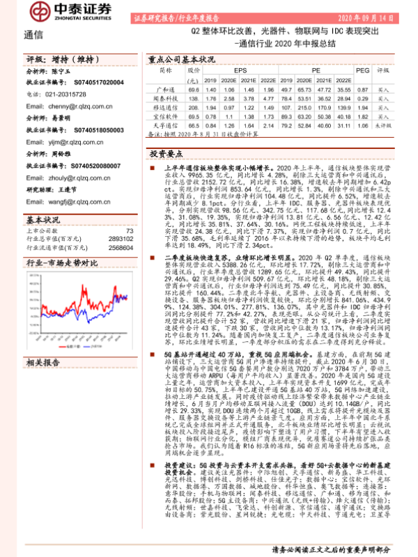 【中泰证券】【20200914】通信行业2020年中报总结:Q2整体环比改善,光器件、物联网与IDC表现突出-35页 行业研究