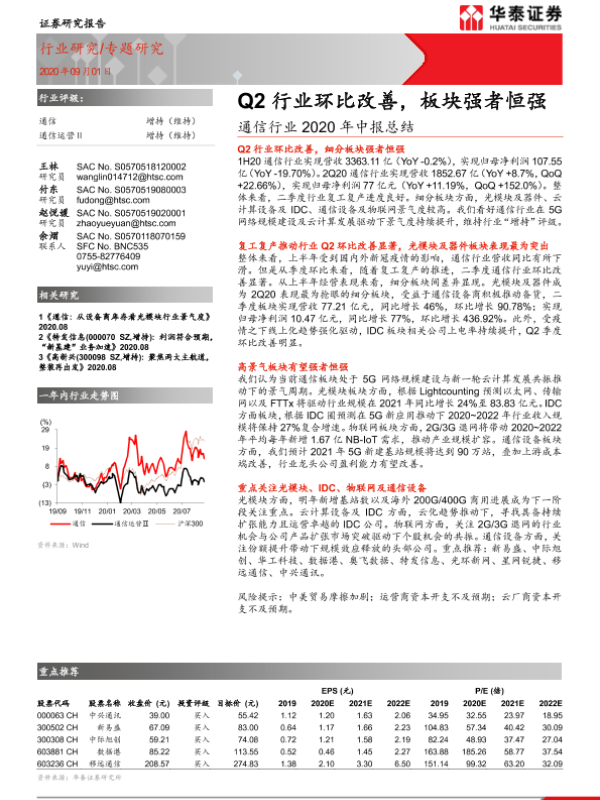 【华泰证券】【20200901】通信行业2020年中报总结:Q2行业环比改善,板块强者恒强-14页 行业研究