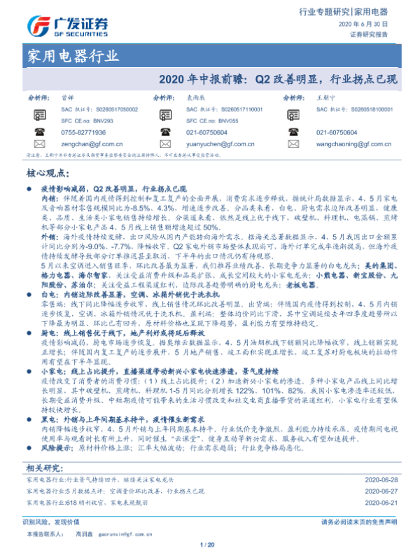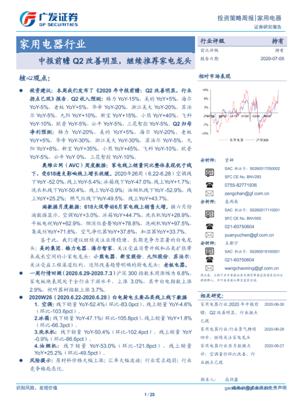 【广发证券】【20200705】2020年中报前瞻:Q2改善明显,继续推荐家电龙头-23页 行业研究