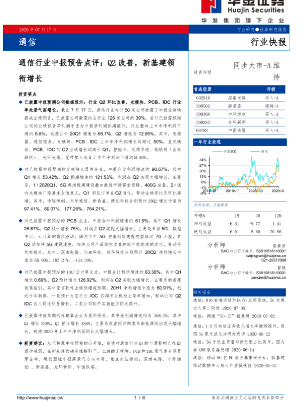 【华金证券】【20200717】通信行业中报预告点评:Q2改善,新基建领衔增长-6页 行业研究