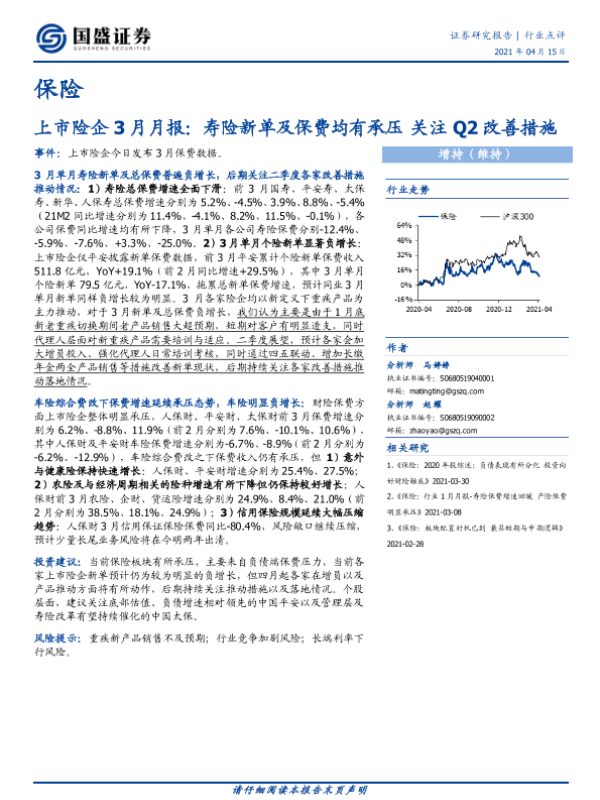 【国盛证券】【20210415】上市险企3月月报:寿险新单及保费均有承压关注Q2改善措施-3页 行业研究