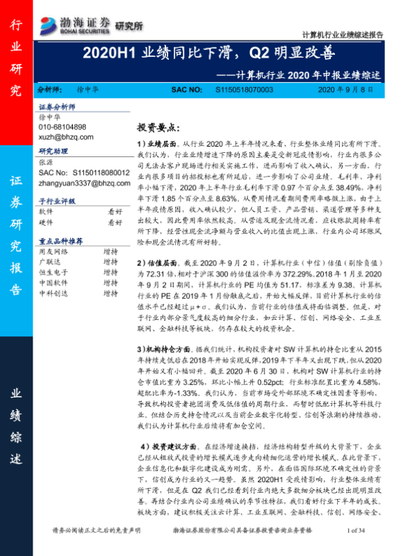 【渤海证券】【20200908】计算机行业2020年中报业绩综述:2020H1业绩同比下滑,Q2明显改善-34页 行业研究