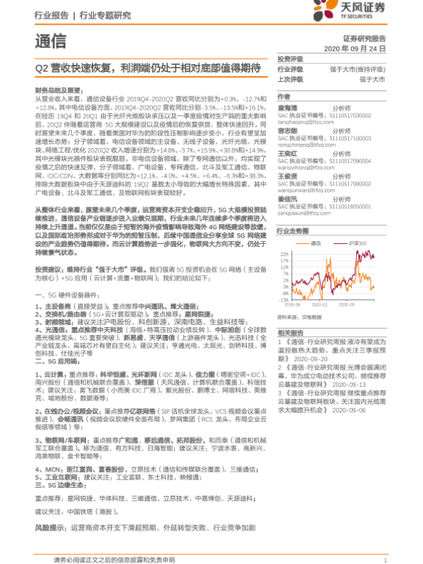 【天风证券】【20200924】通信行业专题研究:Q2营收快速恢复,利润端仍处于相对底部值得期待-31页 行业研究