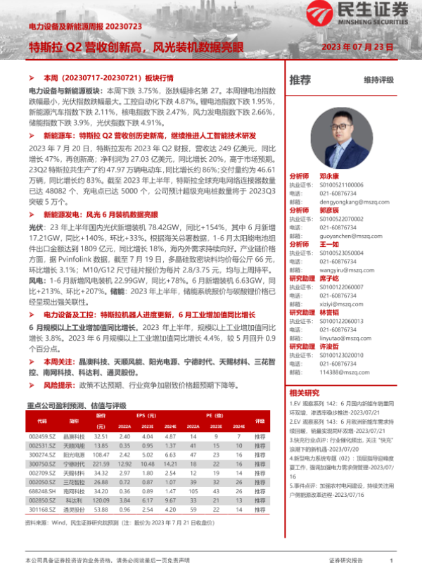 【民生证券】【20230723】电力设备及新能源周报:特斯拉Q2营收创新高,风光装机数据亮眼-29页 行业研究