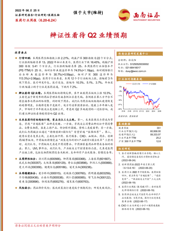 【西南证券】【20220625】医药行业周报:辩证性看待Q2业绩预期-40页 行业研究
