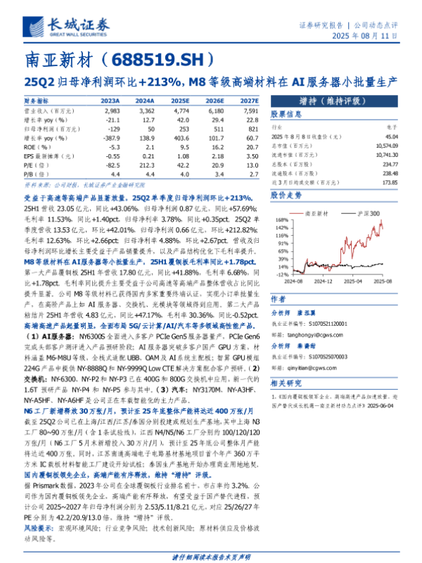 【长城证券】【20250811】25Q2归母净利润环比+213%,M8等级高端材料在AI服务器小批量生产-6页 公司研究