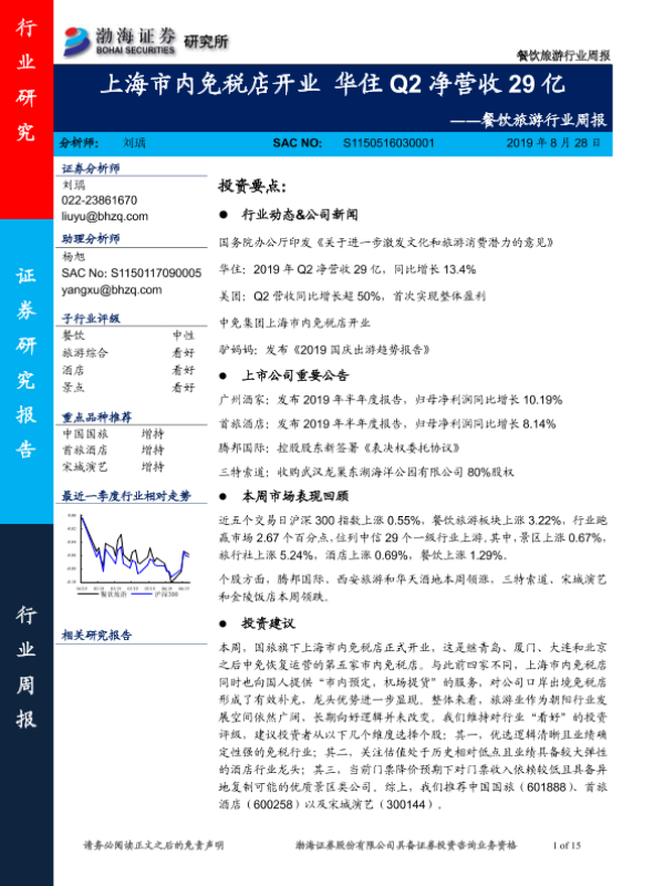 【渤海证券】【20190828】餐饮旅游行业周报:上海市内免税店开业 华住Q2净营收29亿-15页 行业研究