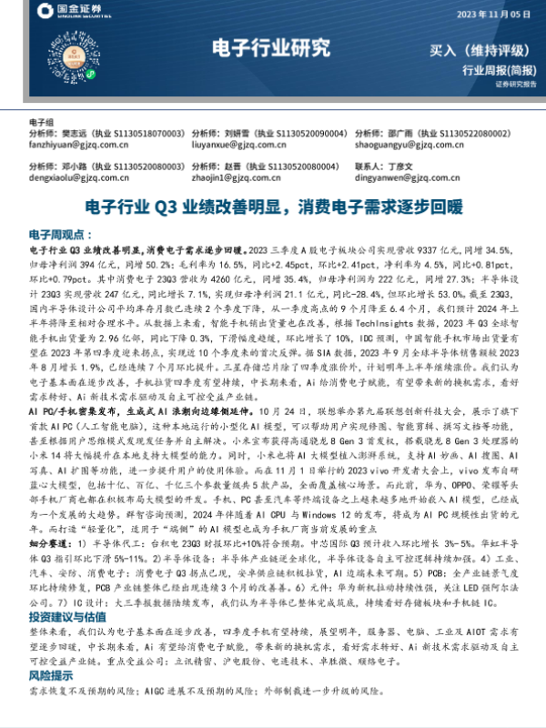 【国金证券】【20231105】电子行业Q3业绩改善明显,消费电子需求逐步回暖-13页 行业研究