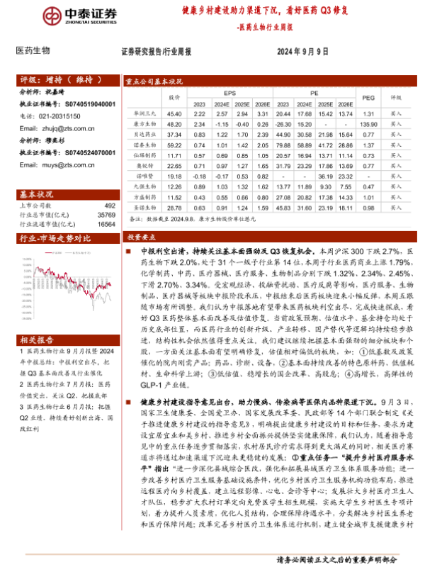 【中泰证券】【20240909】20240909-中泰证券-医药生物行业周报_健康乡村建设助力渠道下沉_看好医药Q3修复-9页 行业研究