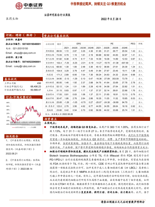 【中泰证券】【20220828】中泰证券医药生物行业周报:中报季接近尾声,持续关注Q3修复的机会-12页 行业研究