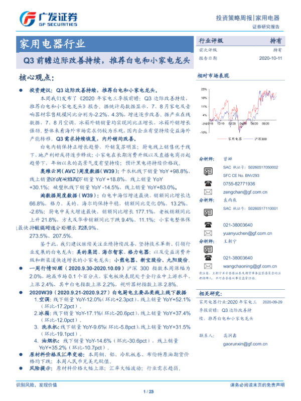 【广发证券】【20201011】2020年家电三季报前瞻:Q3边际改善持续,推荐白电和小家电龙头-23页 行业研究