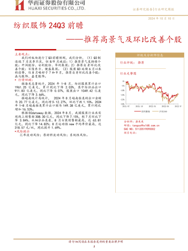 【华西证券】【20241010】纺织服饰24Q3前瞻:推荐高景气及环比改善个股-22页 行业研究