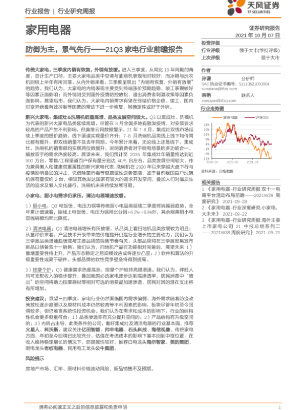 【天风证券】【20211007】20211007-天风证券-行业周报:家用电器:21Q3家电行业前瞻报告——防御为主,景气先行-18页 行业研究