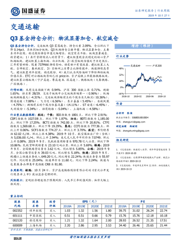 【国盛证券】【20191027】交通运输行业周报:Q3基金持仓分析:物流显著加仓、航空减仓-20页 行业研究