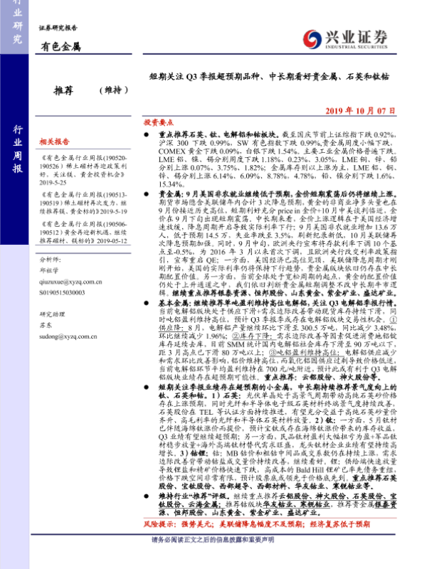 【兴业证券】【20191007】20191007-兴业证券-有色金属行业周报:短期关注Q3季报超预期品种、中长期看好贵金属、石英和钛钴-12页 行业研究