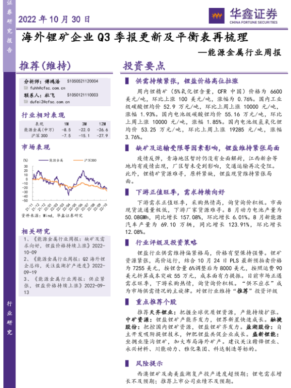 【华鑫证券】【20221030】能源金属行业周报:海外锂矿企业Q3季报更新及平衡表再梳理-23页 行业研究