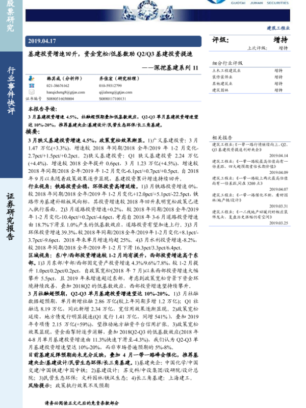 【国泰君安证券】【20190417】基建投资增速回升,资金宽松 低基数助Q2 Q3基建投资提速-3页 行业研究