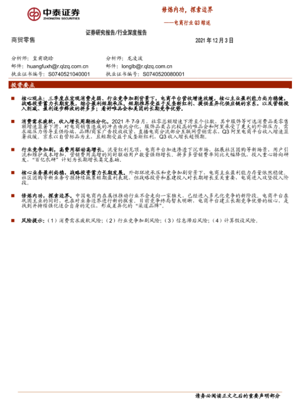 【中泰证券】【20211203】电商行业Q3综述:修炼内功,探索边界-16页 行业研究