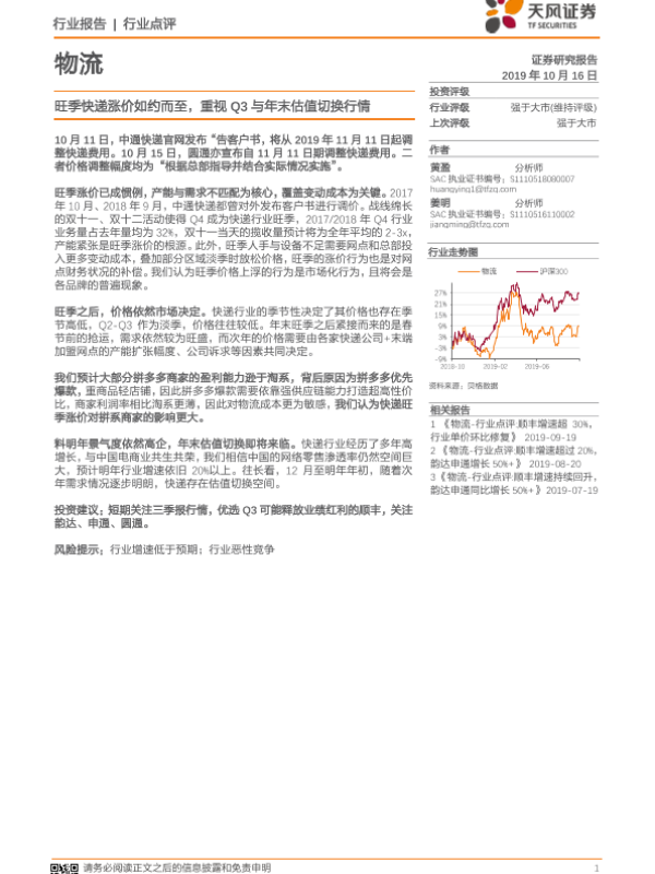 【天风证券】【20191016】旺季快递涨价如约而至,重视Q3与年末估值切换行情-2页 行业研究