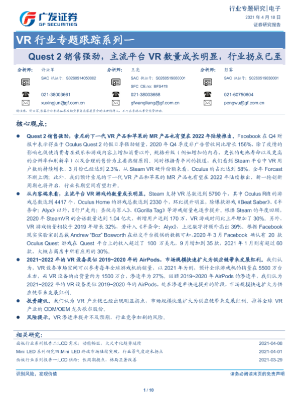 【广发证券】【20210418】VR行业专题跟踪系列一:Quest2销售强劲,主流平台VR数量成长明显,行业拐点已至-10页 行业研究