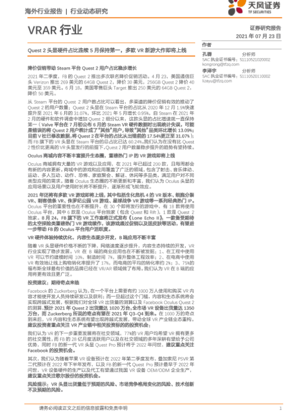 【天风证券】【20210723】VRAR行业:Quest2头显硬件占比连续5月保持第一,多款VR新游大作即将上线-4页 行业研究