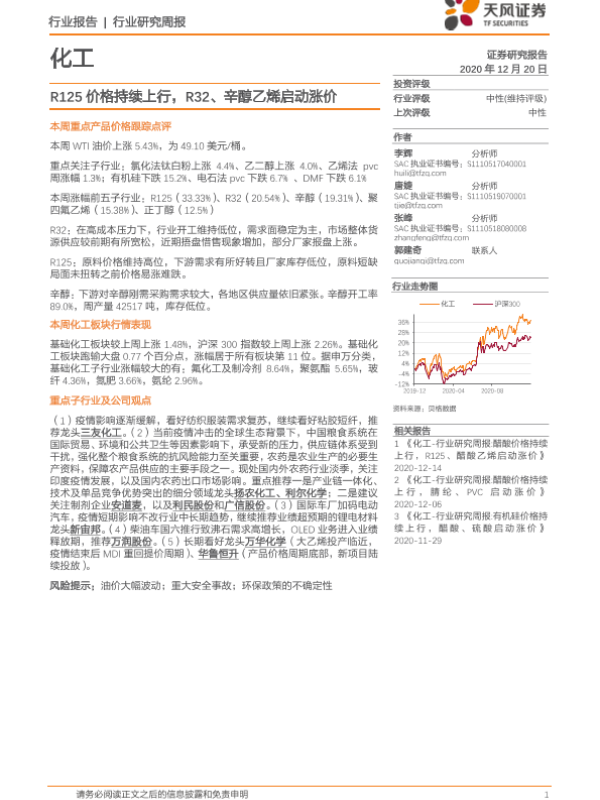 【天风证券】【20201220】20201220-天风证券-化工行业研究周报:R125价格持续上行,R32、辛醇乙烯启动涨价-21页 行业研究