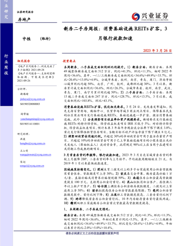 【兴业证券】【20230326】新房二手房周报:消费基础设施REITs扩容,3月银行放款加速-26页 行业研究
