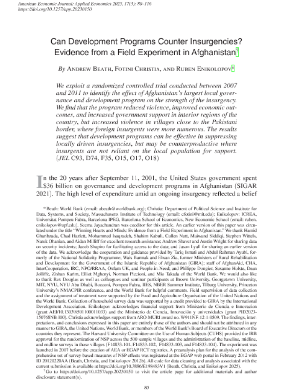 【Andrew Beath&Fotini Christia&Ruben Enikolopov】【2025】Can Development Programs Counter Insurgencies? Evidence from a Field Experiment in Afghanistan-37页 学术论文