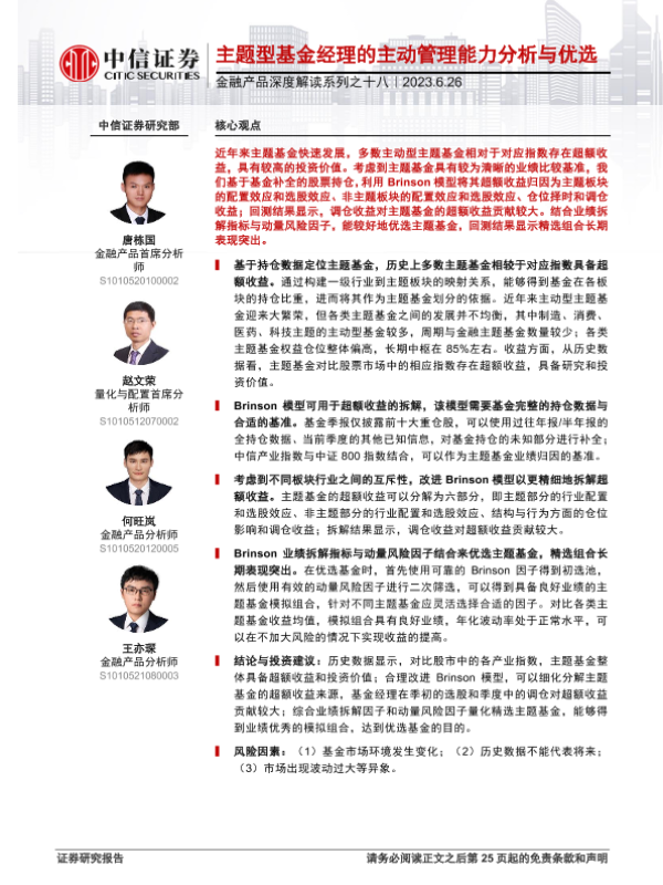 【中信证券】【20230626】金融产品深度解读系列之十八:主题型基金经理的主动管理能力分析与优选-26页 行业研究