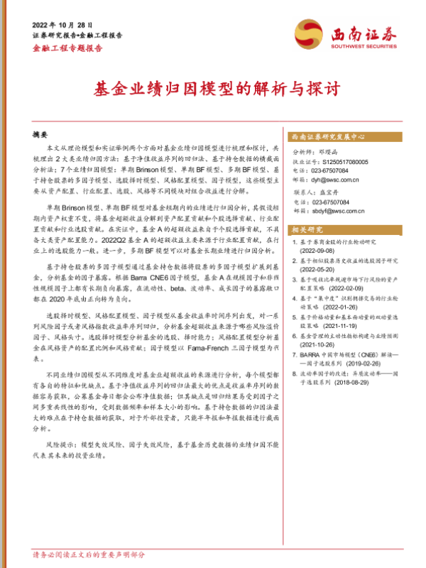 【西南证券】【20221028】金融工程专题报告:基金业绩归因模型的解析与探讨-30页 行业研究