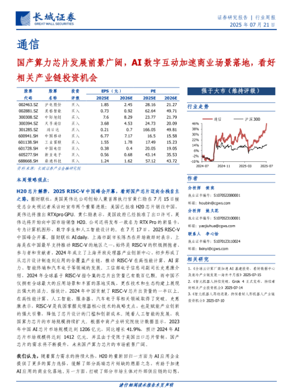 【长城证券】【20250721】通信行业周报:国产算力芯片发展前景广阔,AI数字互动加速商业场景落地-18页 证券期货研究报告