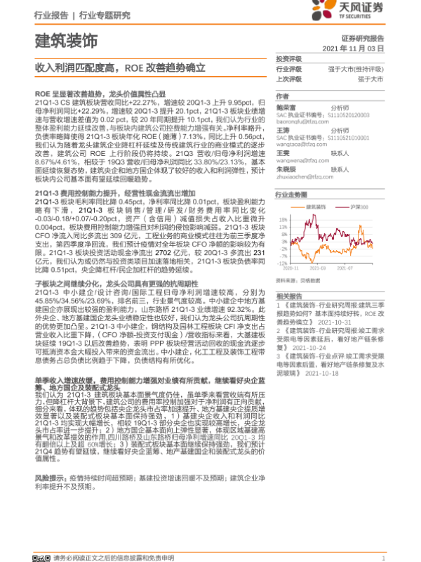 【天风证券】【20211103】建筑装饰行业专题研究:收入利润匹配度高,ROE改善趋势确立-21页 行业研究