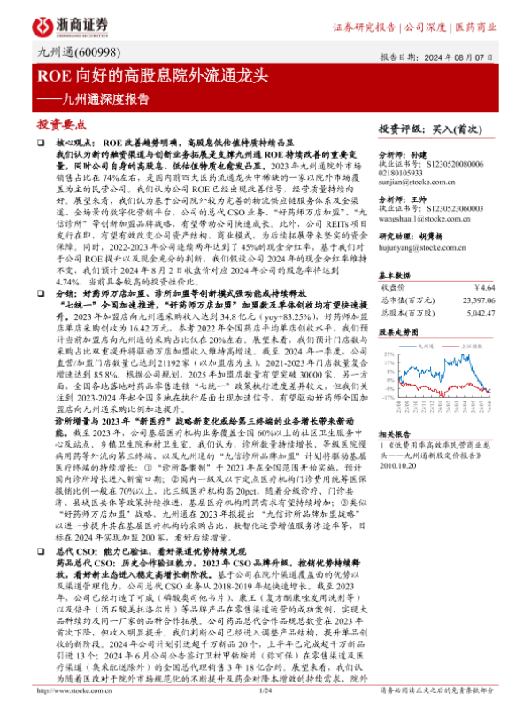 【浙商证券】【20240807】20240807-浙商证券-九州通-600998.SH-九州通深度报告:ROE向好的高股息院外流通龙头-24页 行业研究