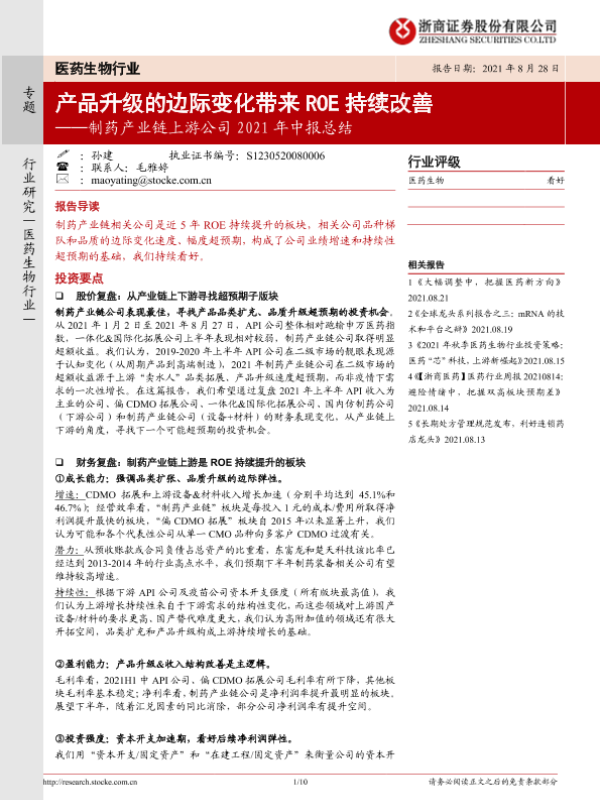【浙商证券】【20210828】医药生物行业:制药产业链上游公司2021年中报总结-10页 行业研究
