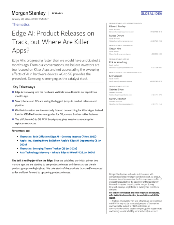 【Morgan Stanley】【202401】Edge AI Product Releases on Track, but Where Are Killer Apps?-17页 行业研究