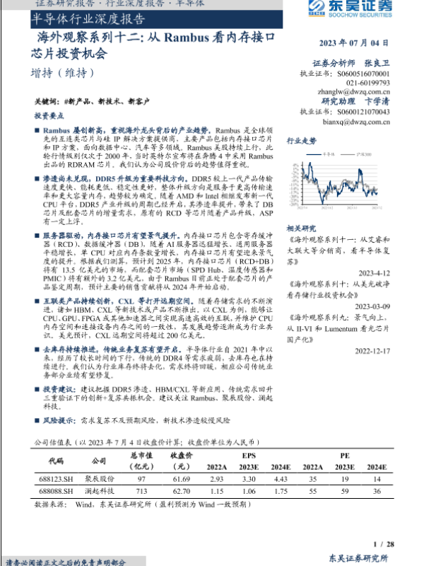 【东吴证券】【20230704】2023年07月05日更新-【东吴证券】半导体行业深度报告-海外观察系列十二-从Rambus看内存接口芯片投资机会-28页 行业研究