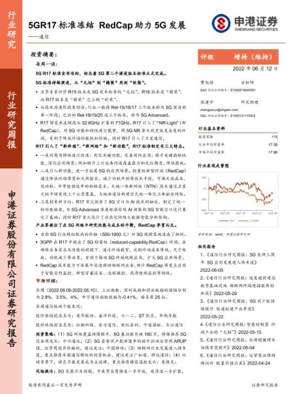 【申港证券】【20220612】5GR17标准冻结 RedCap助力5G发展-10页 行业研究