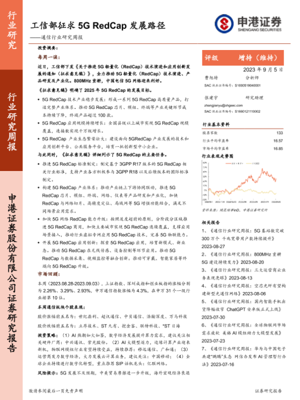 【申港证券】【20230905】通信行业研究周报:工信部征求5G RedCap发展路径-10页 行业研究