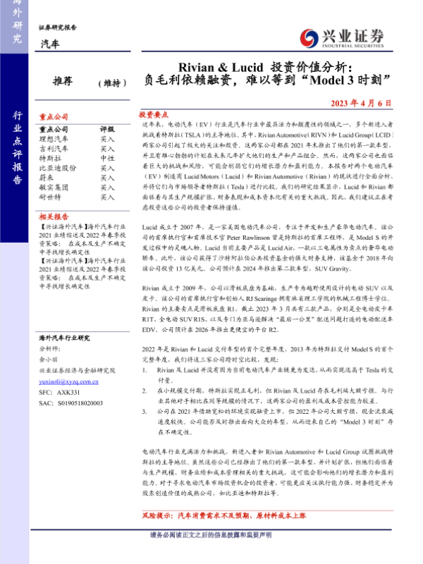 【兴业证券】【20230406】Rivian& Lucid投资价值分析: 负毛利依赖融资,难以等到“Model 3时刻”-14页 行业研究