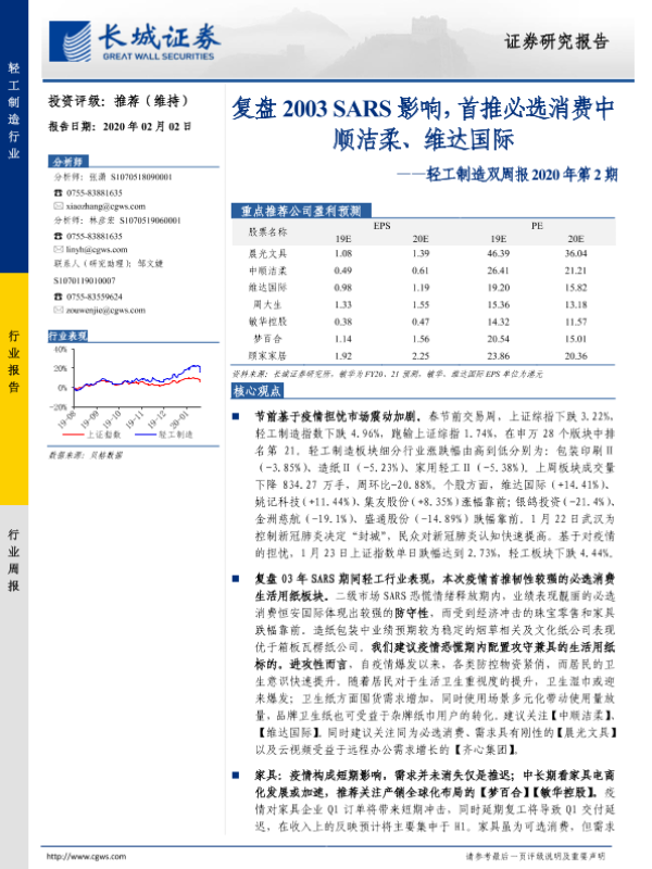 【长城证券】【20200202】轻工制造双周报2020年第2期:复盘2003SARS影响,首推必选消费中顺洁柔、维达国际-30页 行业研究