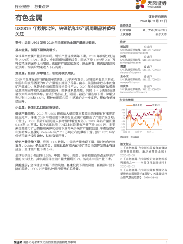 【天风证券】【20200312】20200312-天风证券-有色金属:USGS19年数据出炉,钴锂锆和地产后周期品种值得关注-6页 行业研究